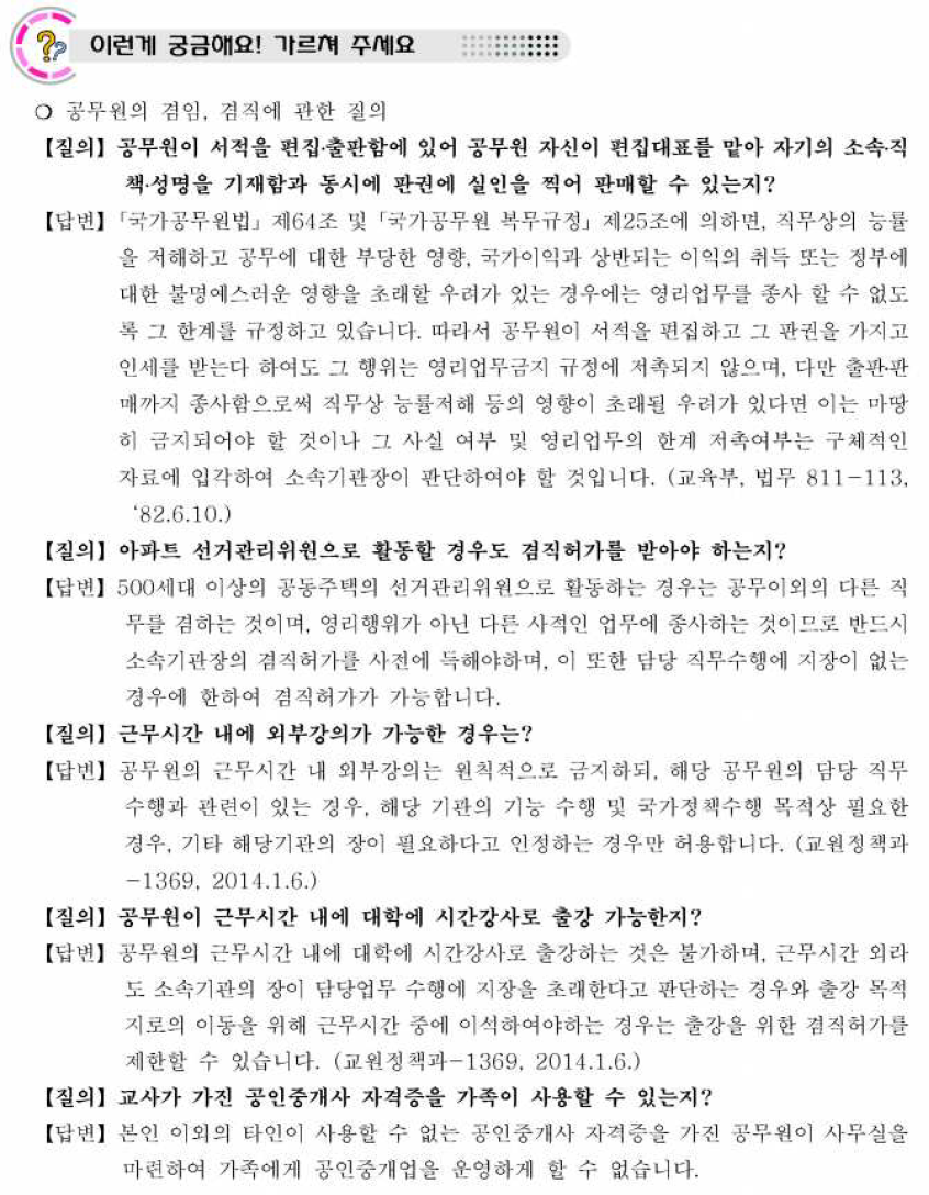 2. 대학의 시간강사, 겸임교수 등으로 위촉되는 경우 : 소속 부서의 장을 경유, 소속기관의 장으로부터 겸직허가를 받아야 함.