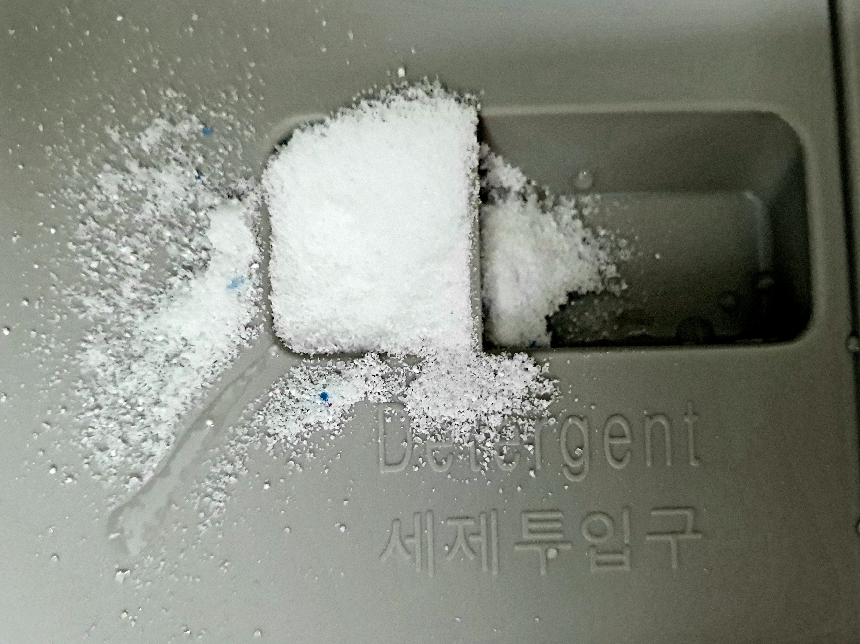 이제 세제투입구에 세제를 넣습니다. 앞서 말씀드린 것처럼 작은 칸에.. 이게 아이러니한 게, 투입구에 넣고 문을 닫으면 그냥 세제가 안으로 툭 떨어지는 겁니다.. 이게 맞는 건가? 싶었는데 맞더라구요 ㅋㅋ