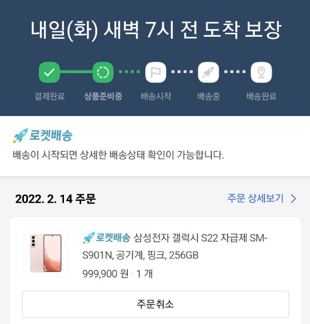 갤럭시 S22 사전예약 기간에 쿠팡에서 핑크골드 색상을 주문했습니다.