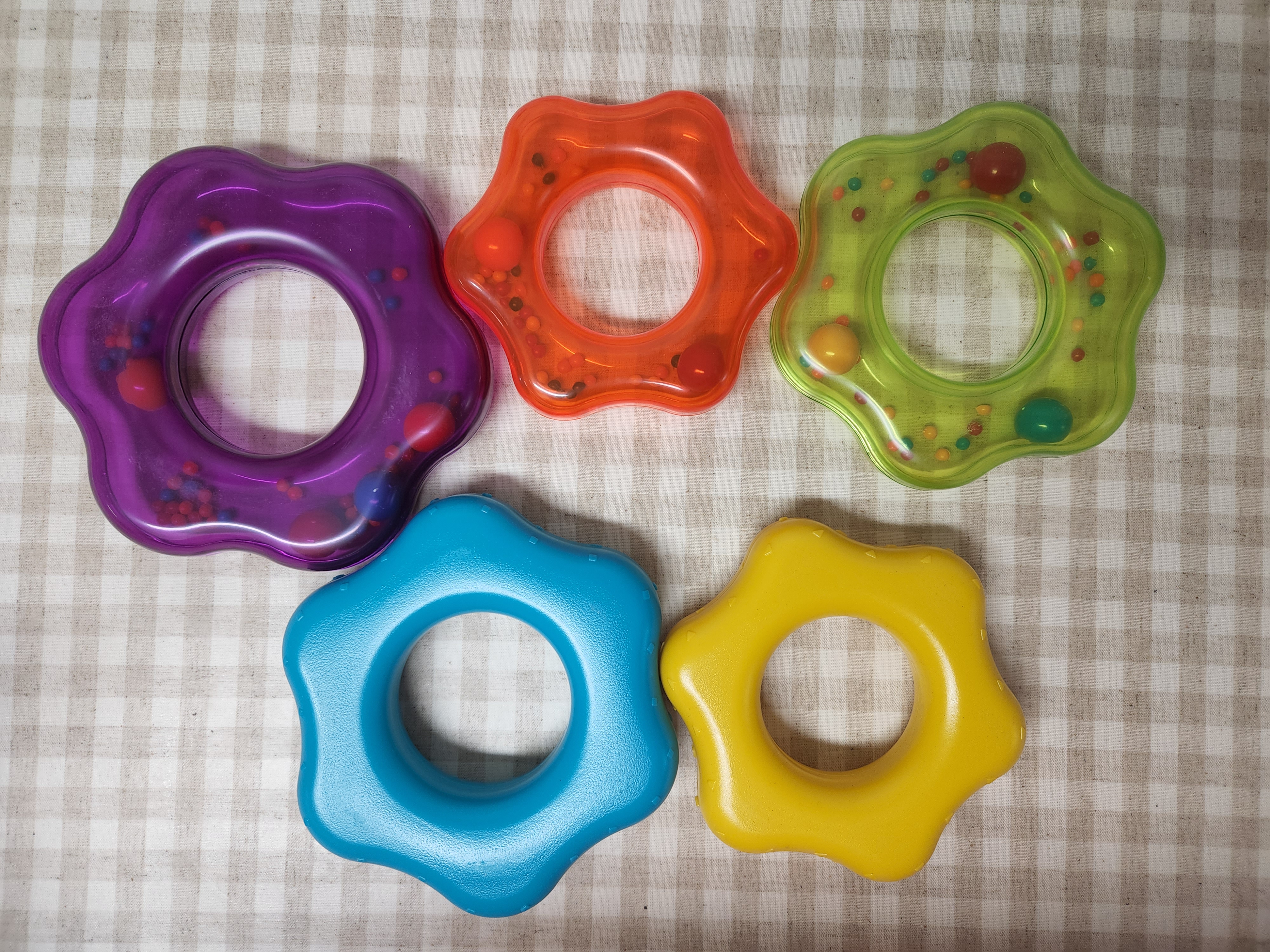 노란색과 하늘색 링은 색만 칠해져 있었고, 보라색과 주황색, 연두색의 링 안에는 크고 작은 구슬들이 들어있었습니다.