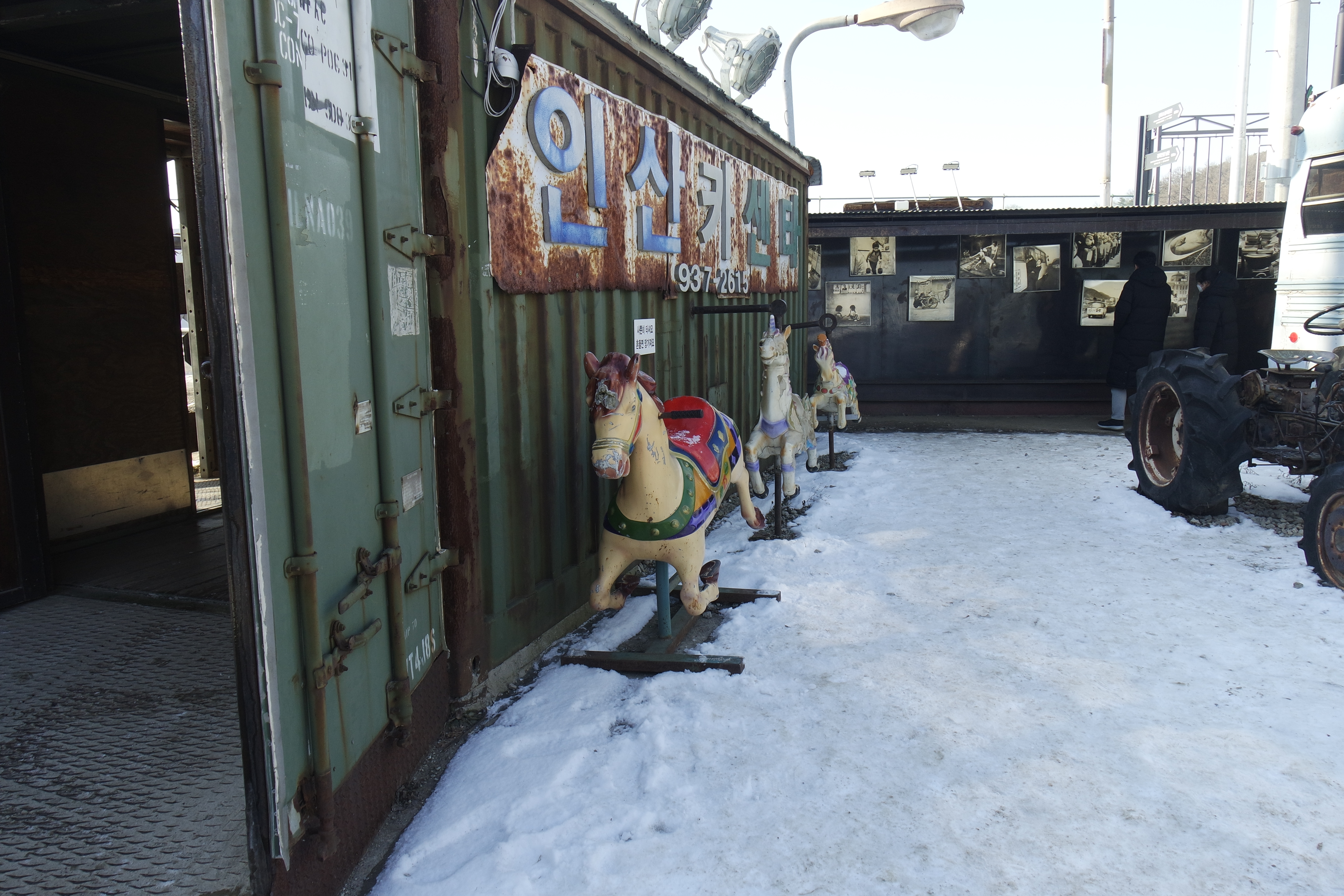입구 쪽에 보이는 옛날 버스와 건물들
