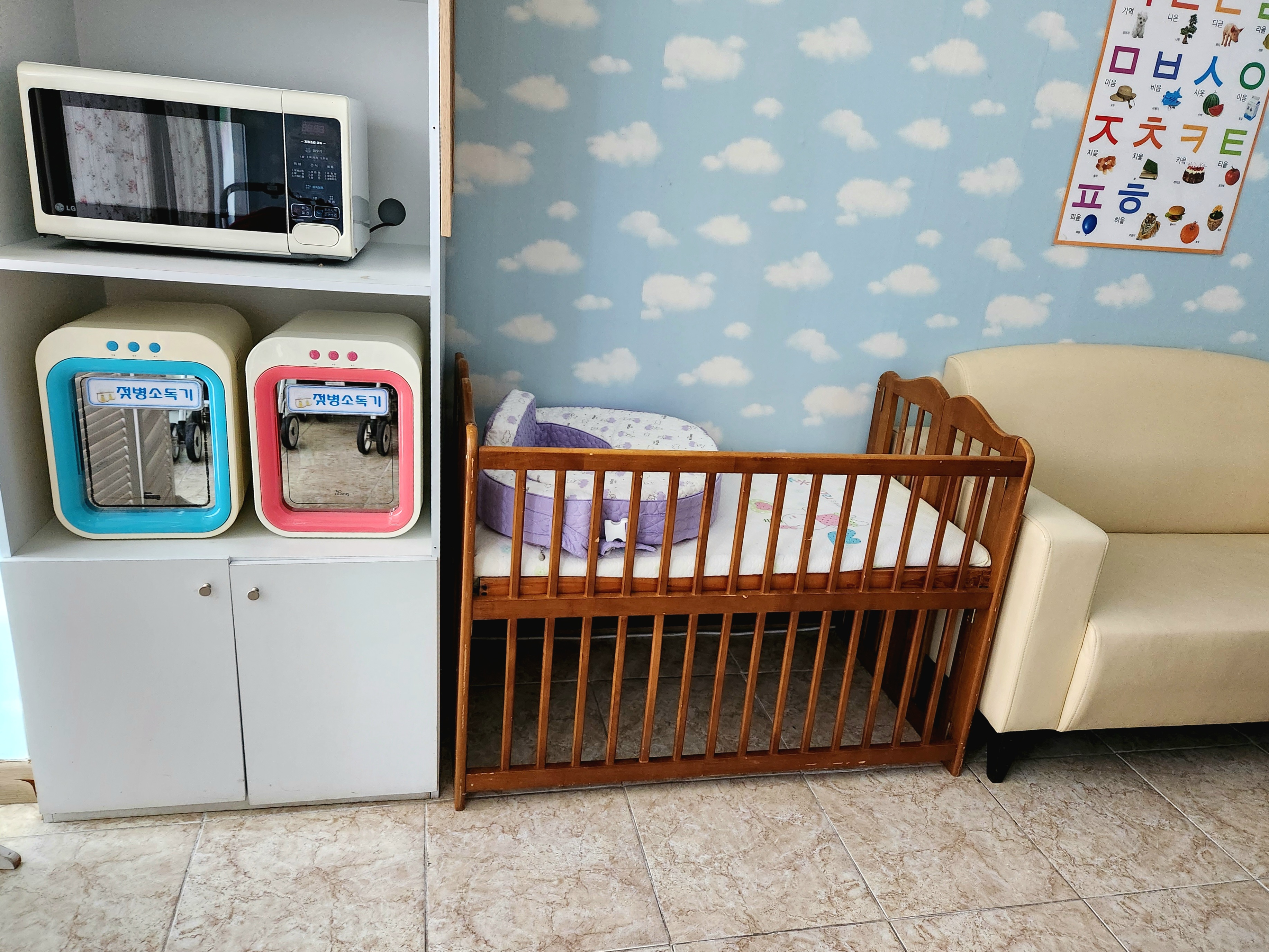 젖병소독기와 전자레인지, 수유쿠션, 아기침대, 소파, 기저귀갈이대, 세면대 등이 있었는데요.