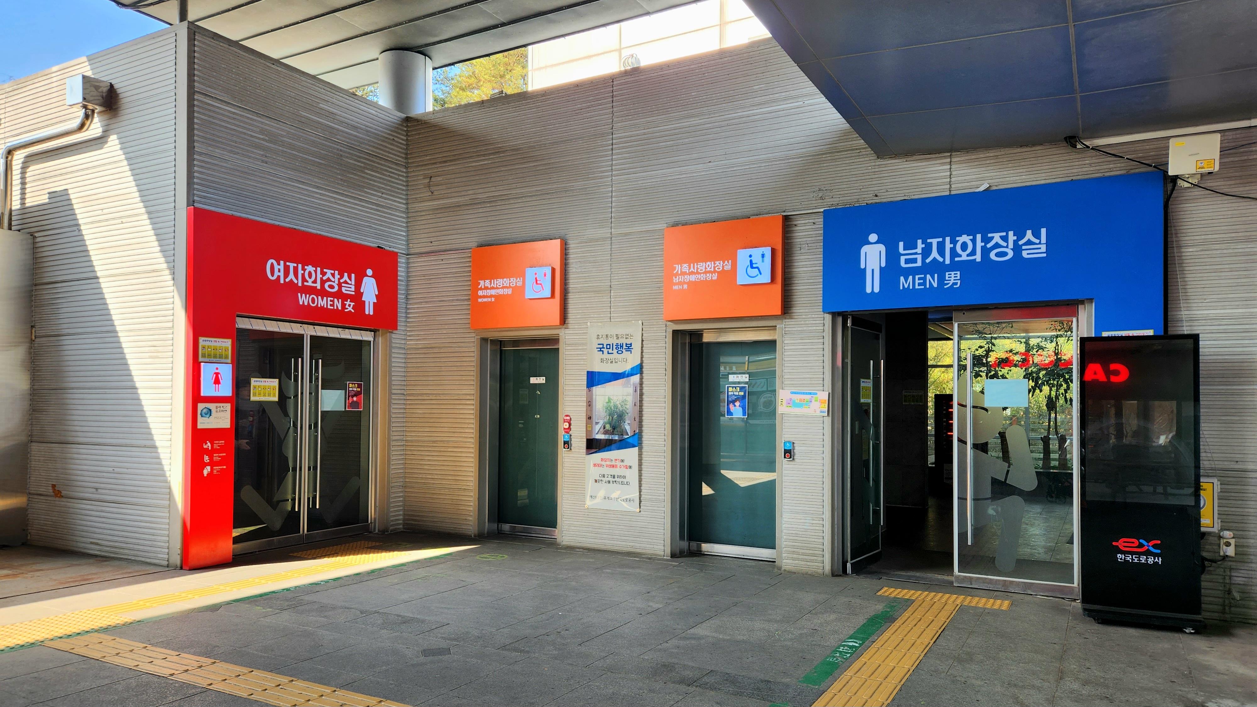 화장실 간판 색이 알록달록, 쨍한 색감이라 멀리서도 잘 보입니다.